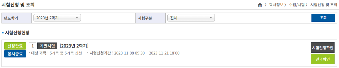 시험>채점 결과 조회로 접속하면 채점 결과를 확인 가능하다
