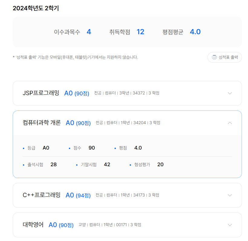 아직 총 점수가 나오지 않은 경우 밑에 기재한 점수를 모두 합산하면 한 학기 시험 점수를 추정 가능하다